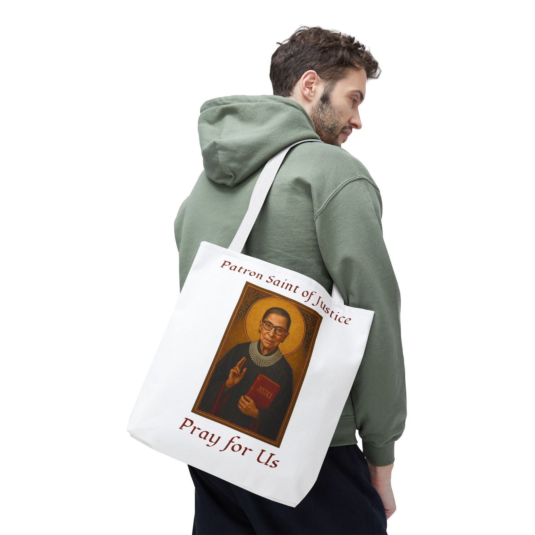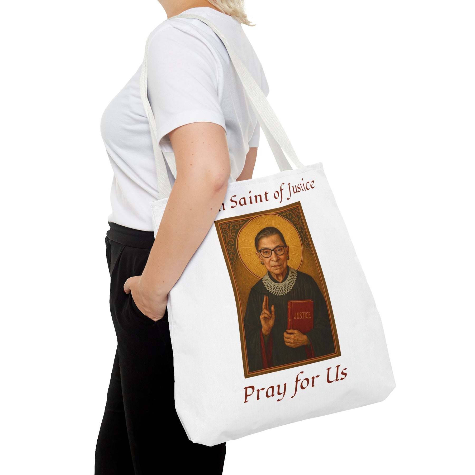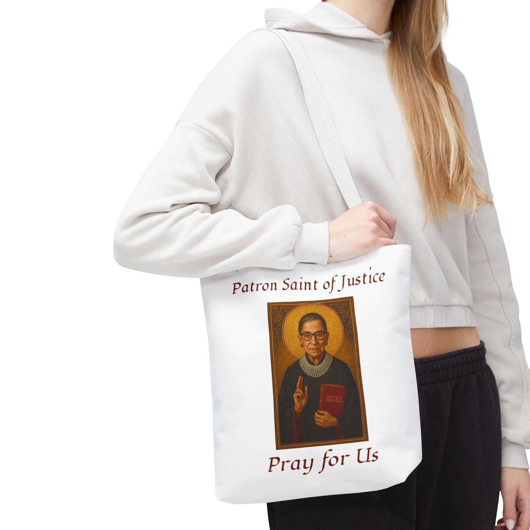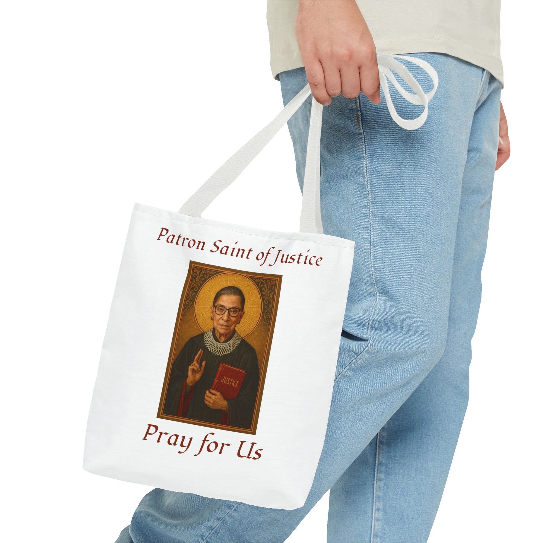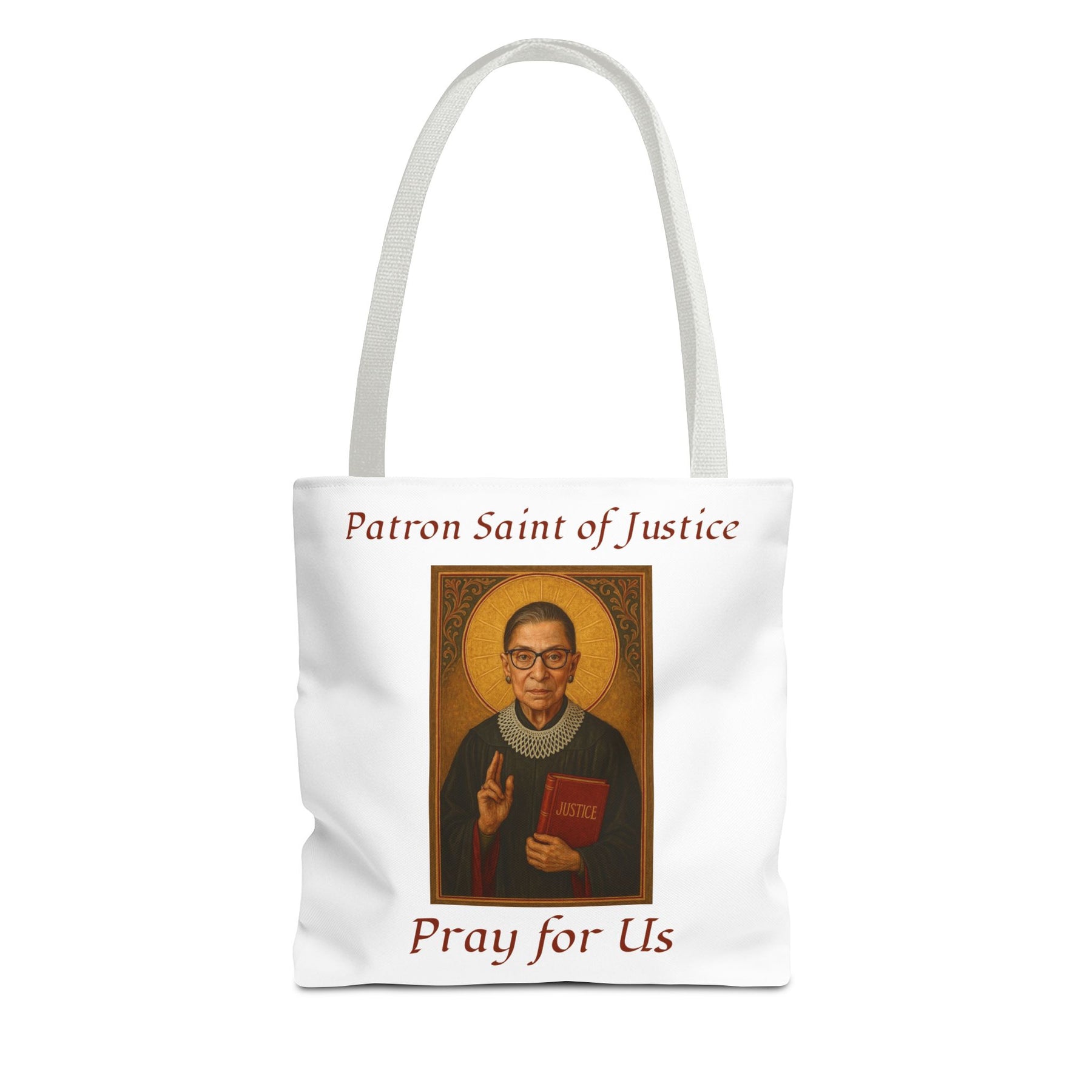 Celebrate the legacy of Ruth Bader Ginsburg with this stylish and durable tote bag, blending practicality with a powerful message. Made from spun polyester with double-stitched seams and sturdy cotton webbing straps, it's built for everyday use. The dye-sublimation printing ensures vibrant, long-lasting visuals, making this tote a perfect blend of function and inspiration. Available in 3 sizes.