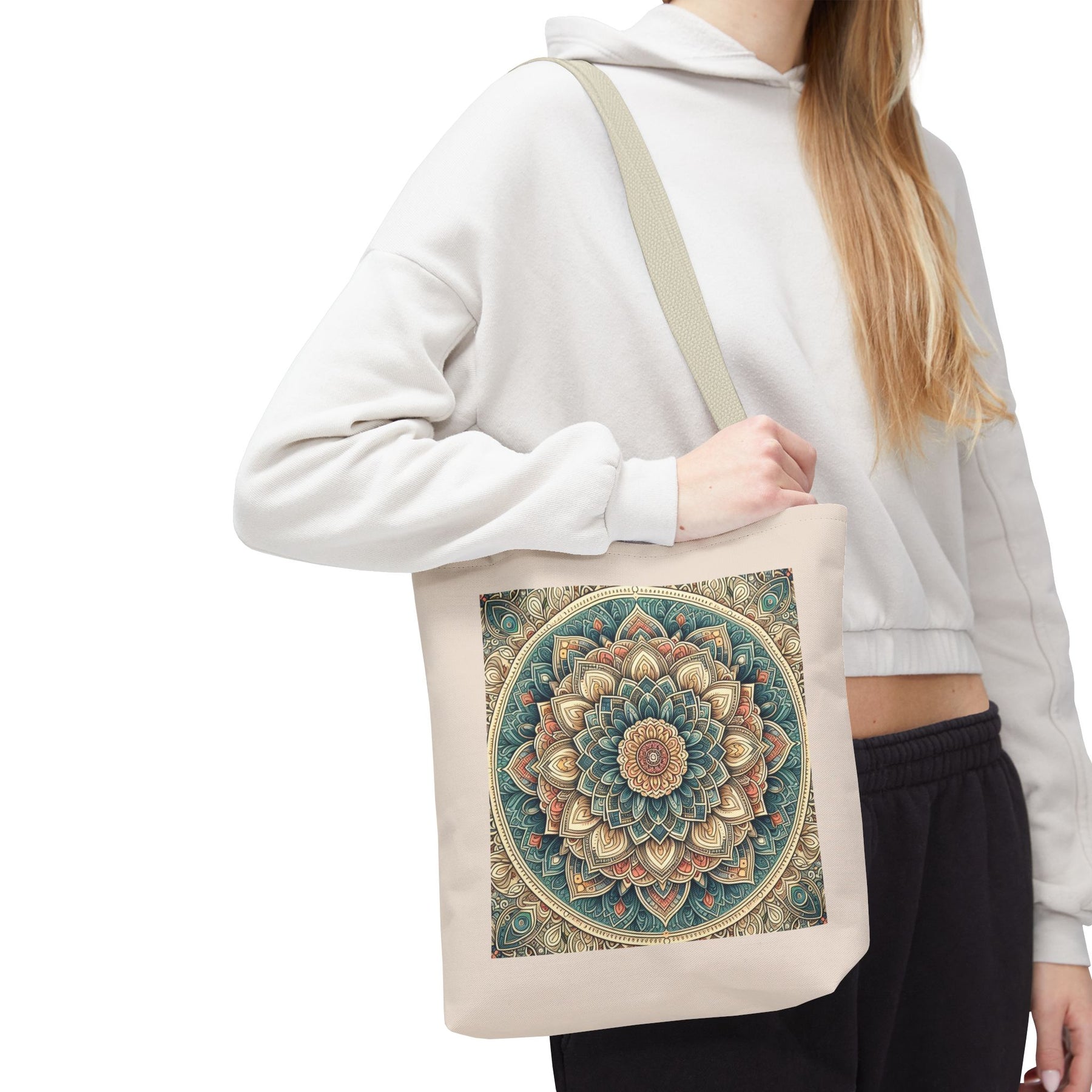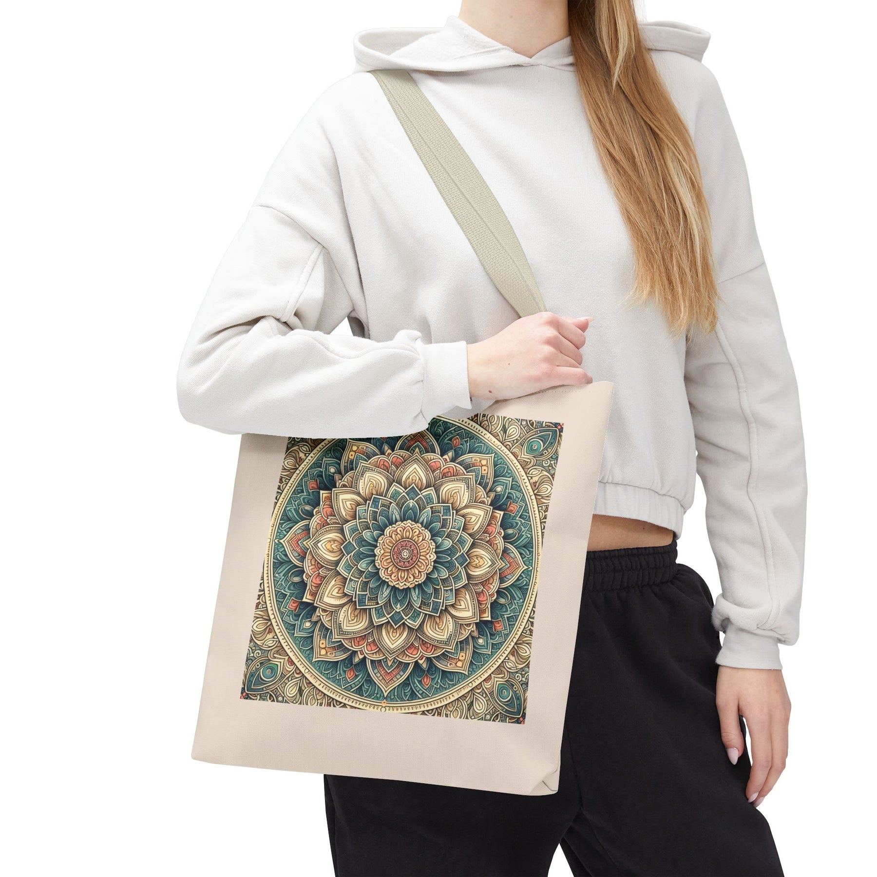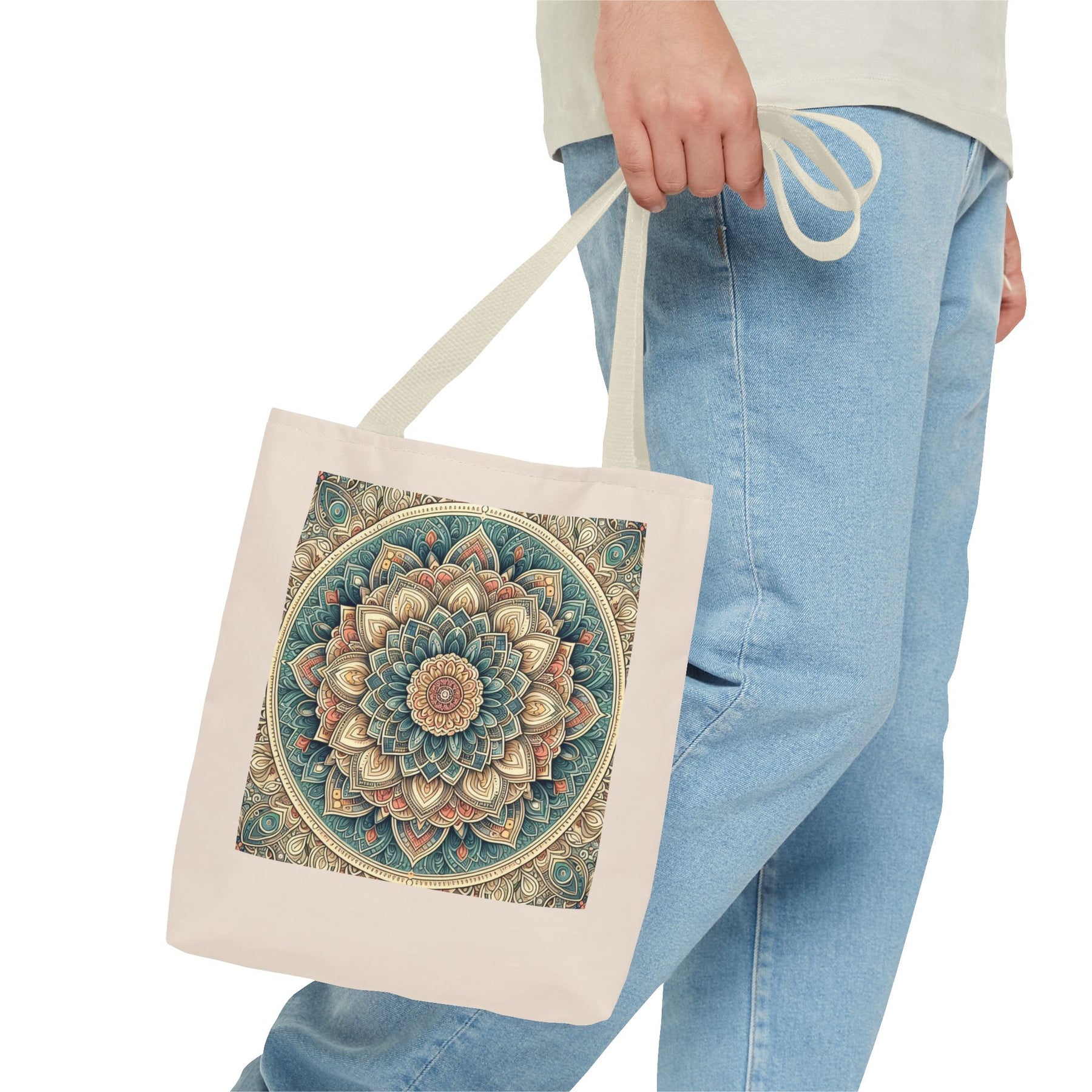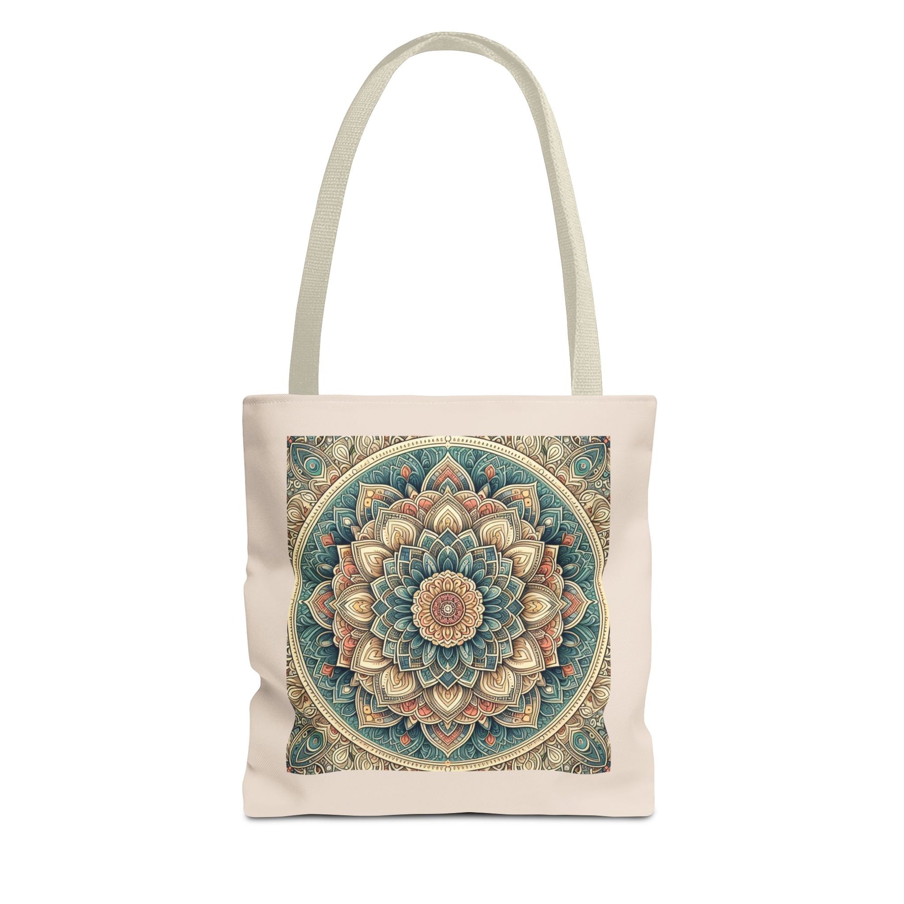 This boho mandala tote bag features an intricate geometric pattern in vibrant colors, perfect for yoga lovers, meditation enthusiasts, and creatives. Stylish and practical, it's a unique artistic carryall for everyday use or gifting.