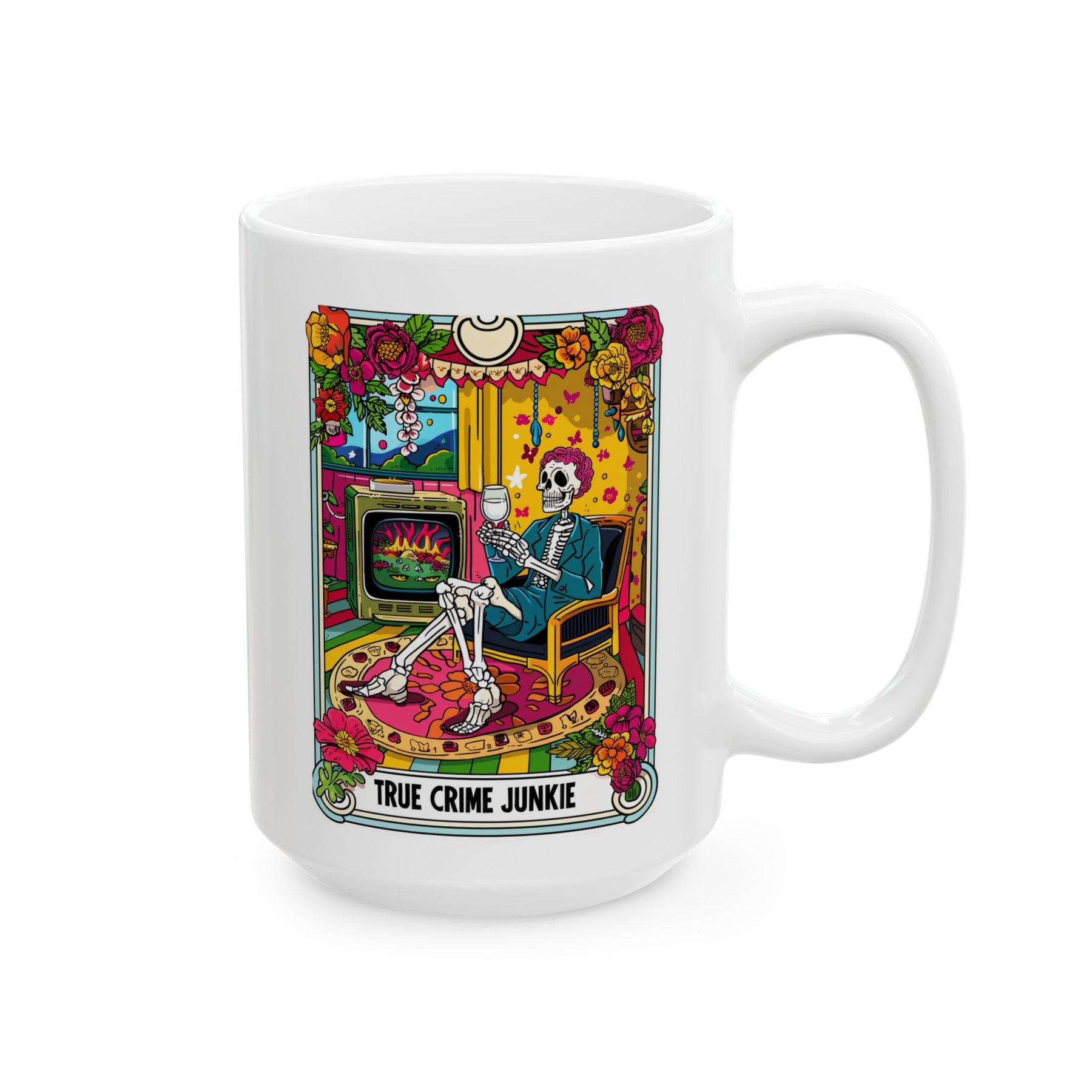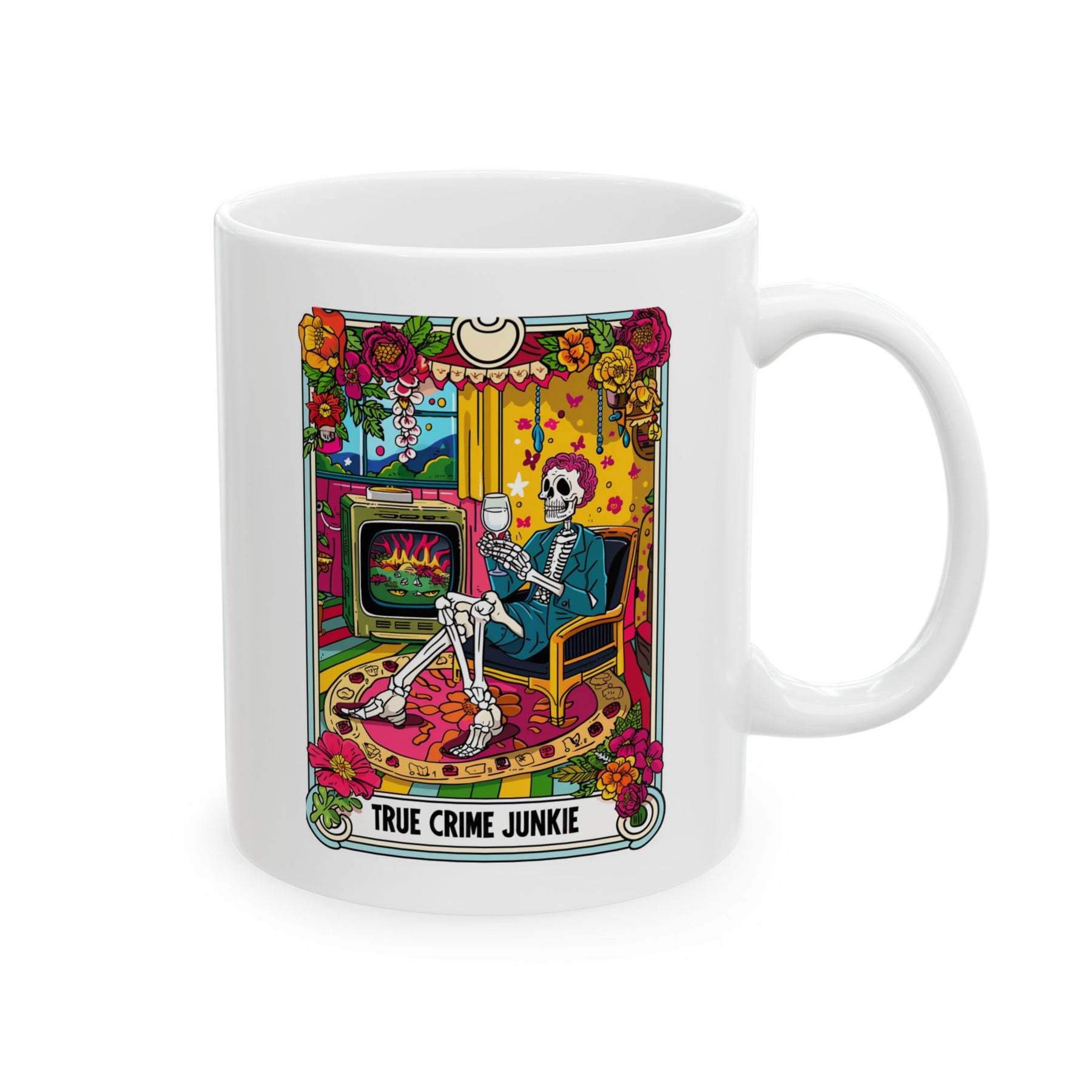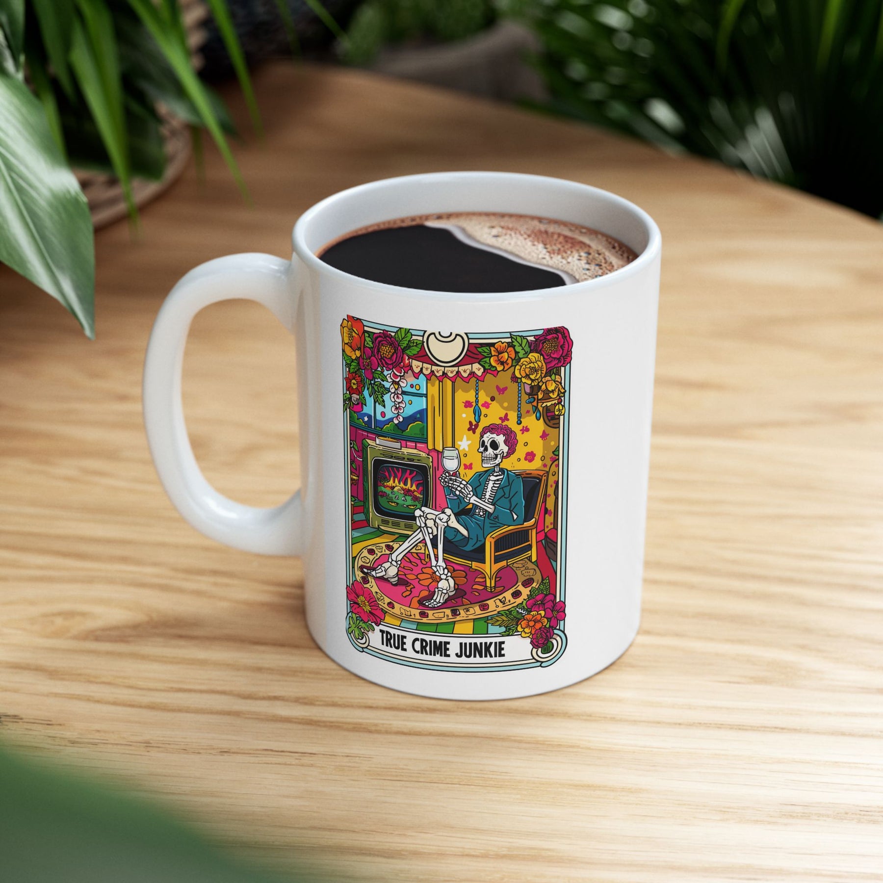 This ceramic mug features a skeleton tarot card image of a true crime fan. Add a touch of mystery and intrigue to your morning coffee or tea routine. Ideal for the true crime fan in your life, goth enthusiasts, and anyone who loves a darker sense of humor.